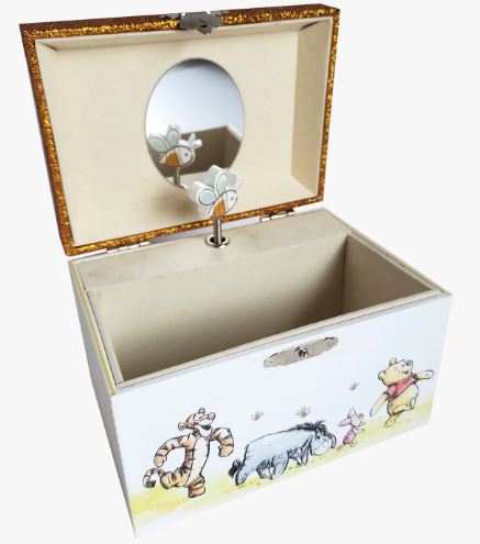 Keep your trinkets and jewelry safe from any Heffalumps! This musical jewelry box has a golden glittery top and features all our favorite friends from the hundred-acre woods. The inside features a velvety lining, mirror and spinning bee.