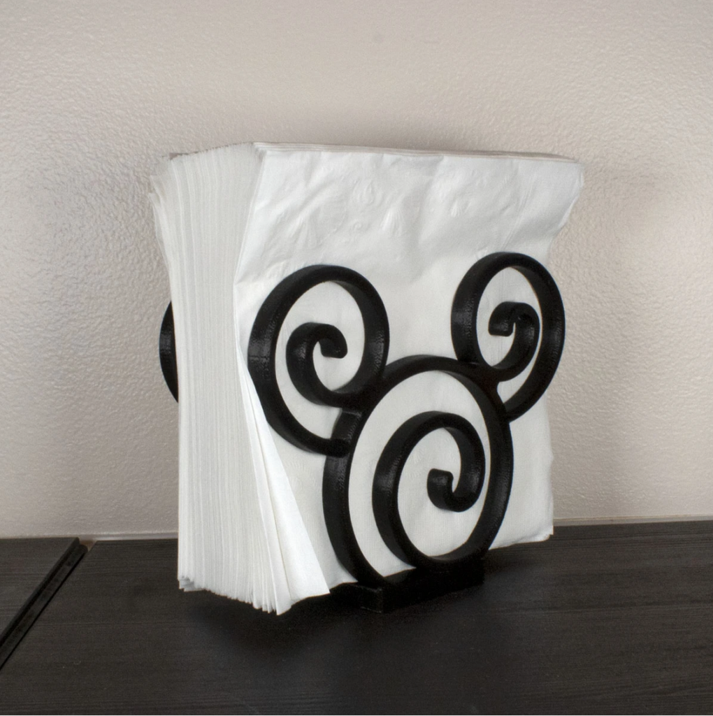 There is also a Mouse Head Holder. The swirly design of this holder is sure to add a bit of whimsy to any table. This black holder is sure to make a statement. Especially if you pair it with brightly colored plain napkins.