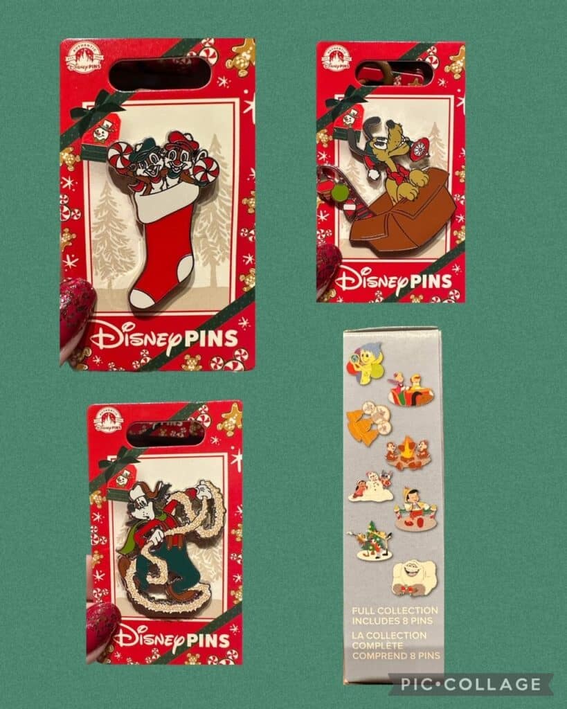 We start with a wreath pin. This wreath is reminiscent of the street light decorations that are found on Main Street, USA. I almost expect to see snow falling as I gaze up at this wreath. The next set of pins features Minnie in her Petticoat “Making the season Bright”. Yes, girl! Mickey strolls in his letter sweater with a present (for Minnie?) tucked under his arm sending “Best Christmas Wishes”. They look straight out of a Hallmark movie! Moving along to the third in we find Mickey with a CHEER banner ready to deck the halls! The last box is a set featuring tree decorating friends!