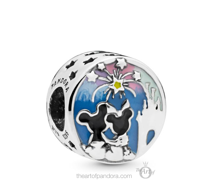 This button charm paints a beautiful scene of Mickey and Minnie watching the fireworks over the castle. Arm in arm, this sweet charm captures the wonder of Disney at night. This charm is expected to retail for $70.00.