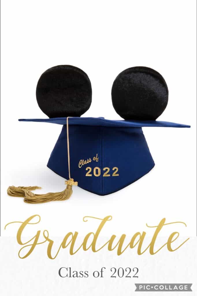 Brought back by popular demand is the Mickey Mouse Ear Hat Graduation Cap. This Classic features a blue mortar board yellow tassel, Mickey ears and “Class of 2022” embroidered in script. Whether you’re celebrating at the parks or in your hometown, people will know two things about you: #1 You love Disney and #2 You Graduated! Grab one for your graduate here.