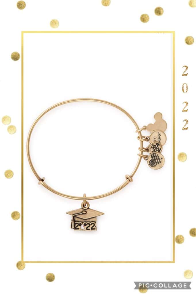 Alex and Ani introduced a stunning brass bracelet for the Disney Fashionista graduate. The eye catching bracelet includes 5 charms to celebrate. The main charm features a graduation cap, engraved 2022 and a crystal gem. Subsequent charms on the bracelet celebrate “Made in American with Love,” “Infused with Positive Energy,” “Recycle,” and of course, a Mickey head! What Disney jewelry wouldn’t be complete without a Mickey head? Click here to purchase!