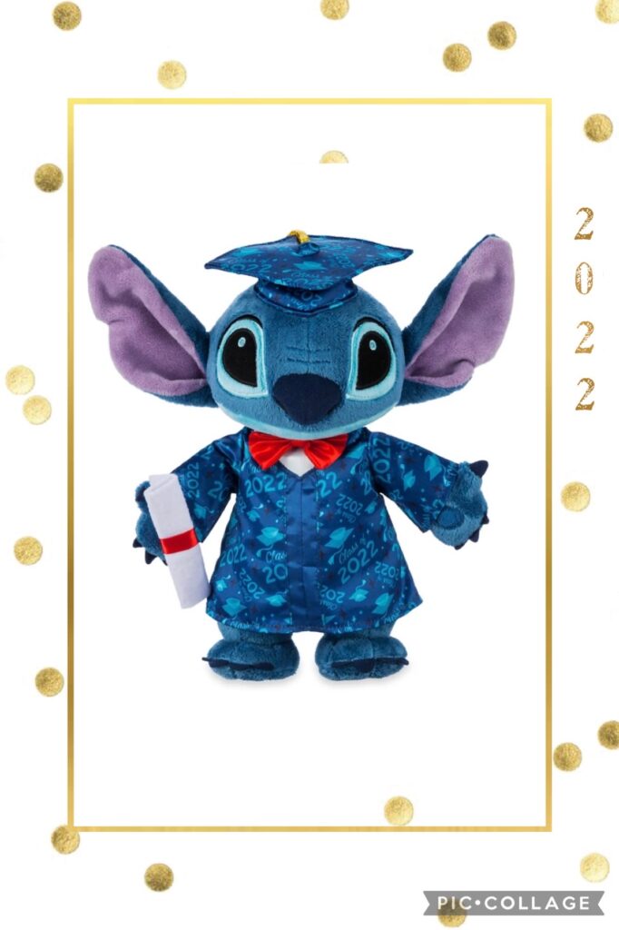 Yes! It’s graduation time and Disney is ready to help you celebrate the special milestone. ShopDisney has introduced three new products and brought back a favorite. The first product is a plush Stitch, the party animal himself! He is ready to move his tassel dressed in a 2022 dated robe, mortar board, and diploma in hand. Can’t you just see him tossing his cap in the air in celebration? Take Stitch home here.