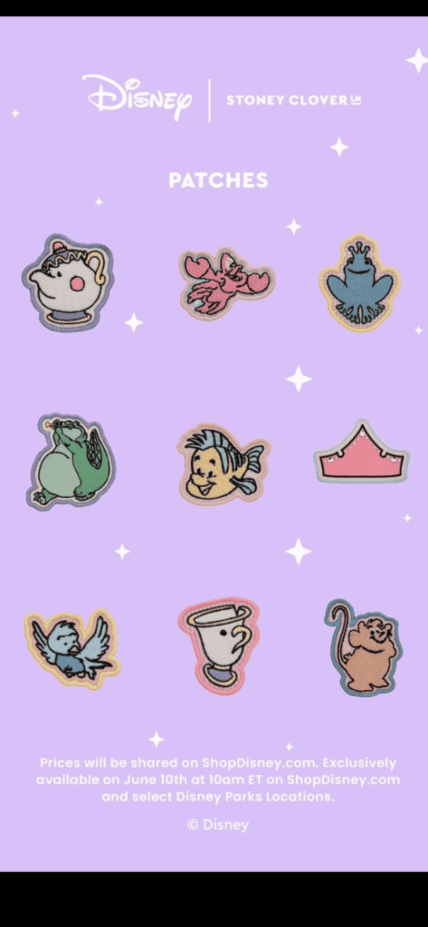 I think the most exciting part of this collection is that Stoney Clover patches will be available through ShopDisney and at the parks for the first time! You’ll be able to choose from princess pals like Chip and Sebastian, as well as icons like Aurora’s iconic crown.
