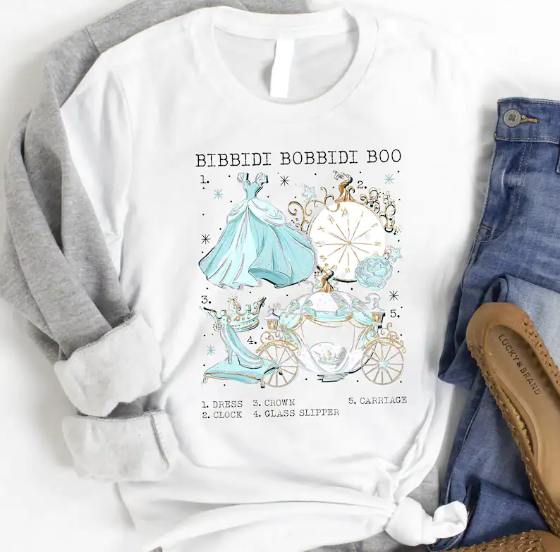 Step into a fairy tale when you wear this Cinderella inspired shirt! This ice blue and gold design includes Cinderella’s ball gown, the clock striking midnight, her crown, glass slipper, and carriage. You can get it HERE.