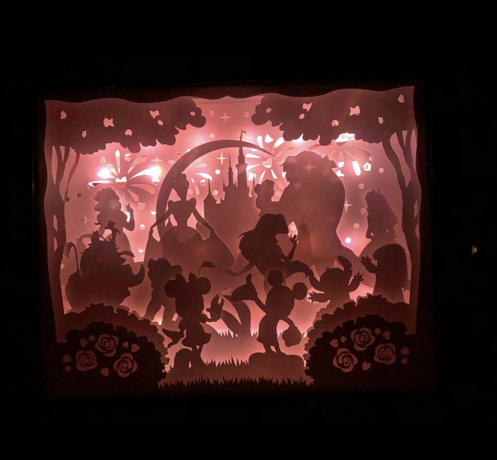 Handmade with white cardstock and a deep black frame, this shadow box is great for use as a night light, or stand alone decoration on the table, mantle or any other place you want to show your Disney style!
