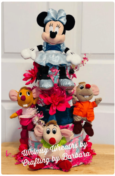 This is a Large 3 Teir Cinderella inspired Diaper Cake made with a beautiful plush Minnie dressed as Cinderella. Three mice decorate this beautiful diaper cake, making it the perfect gift for a baby shower for any soon-to-be Princess.