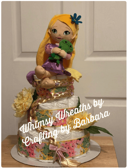 Make the baby shower the Best Day Ever with this Tangled theme diaper cake! This design features a plush of Rapunzel holding on to Pascal.