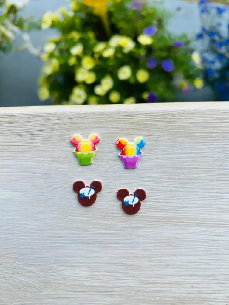 For the Shaved Iced design, each stud features a clear acrylic “cup” of pastel rainbow shaved ice topped with a tiny white flower. Of course, this shaved ice has mouse ears, which is like a secret sprinkle of Disney magic.