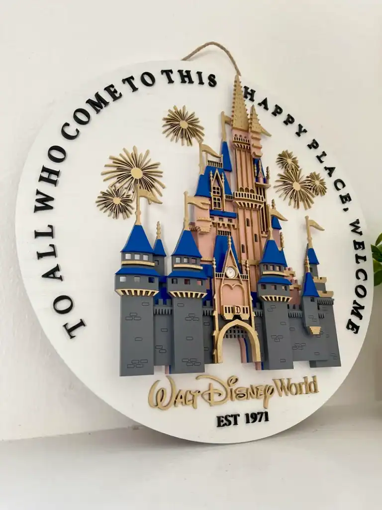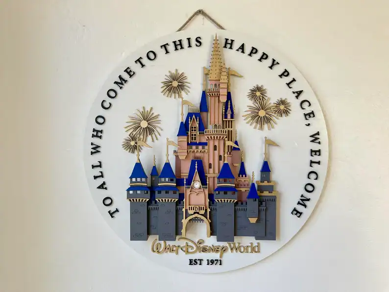 Elevate your Disney decor with this wood Disney World “To all who come to this happy place, welcome” sign! It’s an incredible piece of art with layers that give it a depth that is really remarkable. Make this stunning piece a part of your home and hang it in the room that inspires you the most!