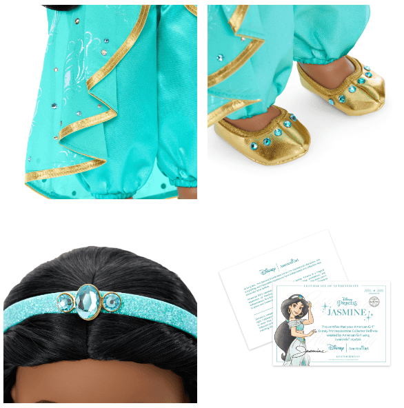 Jasmine is compassionate toward her kingdom and always stands up for what’s right. Celebrate this beloved Disney Princess with this exquisite collector doll, adorned from head to toe in Swarovski® crystals. This limited-edition Disney Princess doll is part of the American Girl® Collector Series. No more than 4,000 American Girl® Disney Princess Jasmine Dolls have been created worldwide.