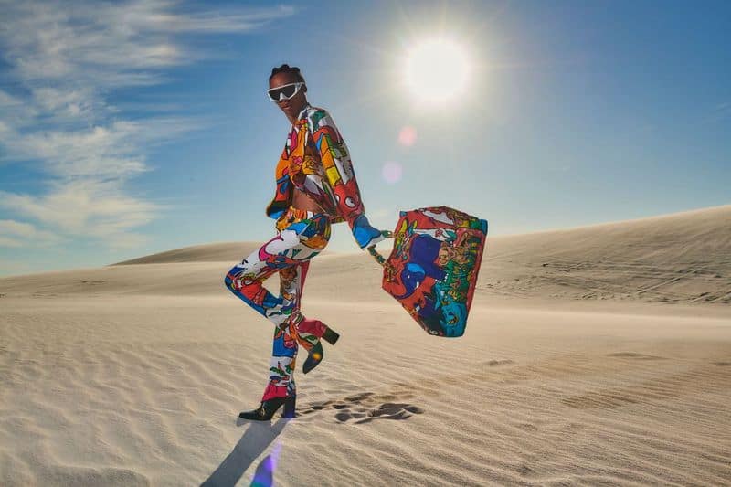 Cameroonian painter Enfant Precoce’s concentrates on Disney’s Simba, with his artwork showing “The Lion King” star navigating through a dreamlike landscape filled with an array of African wildlife. Precoce’s design—in an array of black-and-white and multi-colored variations—covers totes, coats, suits, tees and gowns.