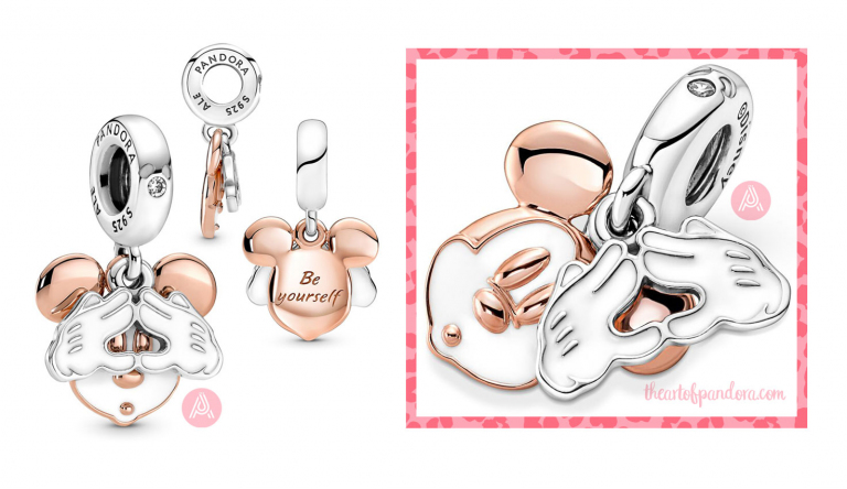 You can “BE YOURSELF” when you add this Mickey Mouse Double Dangle Charm to your bracelet! This two-tone charm includes two separate dangle elements. First, Mickey Mouse looks surprised in beautiful rose gold and white enamel. Then to add to the fun, his white gloved hands play peek-a-boo. While this charm is part of the Pandora Valentine’s Day 2022 collection, I think it is perfect for any time of year. US pricing will be $75.00.