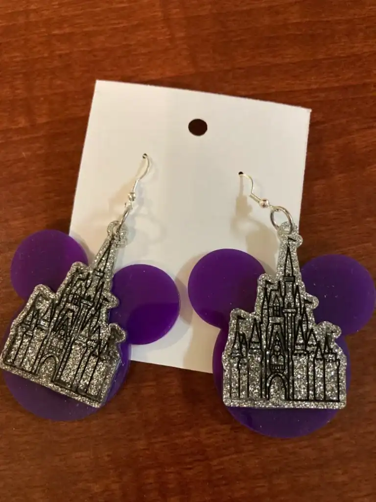 Add these commemorative earrings to your park outfit today! Boho style arched Disney fireworks and castle scene hangs from silver ball post earrings. The castle is made of purple acrylic, glued to iridescent acrylic fireworks scene with silver painted highlights. You can find them on Etsy from LulaandLoi for $14.99.