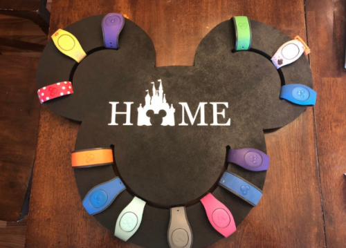 This sign is shaped like a Mickey Mouse head icon, features an adorable “Home” logo with the silhouette of Mickey Mouse in Cinderella Castle as the “o,” and has slots where you can store and display all of your favorite MagicBands! Plus, it already has the hanging wire attached to the back, so it will be a breeze to display! The best part is that it can hold up to 25 MagicBands, depending on which type of bands you want to display!