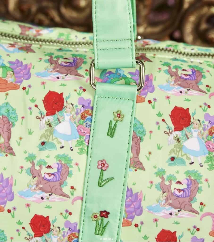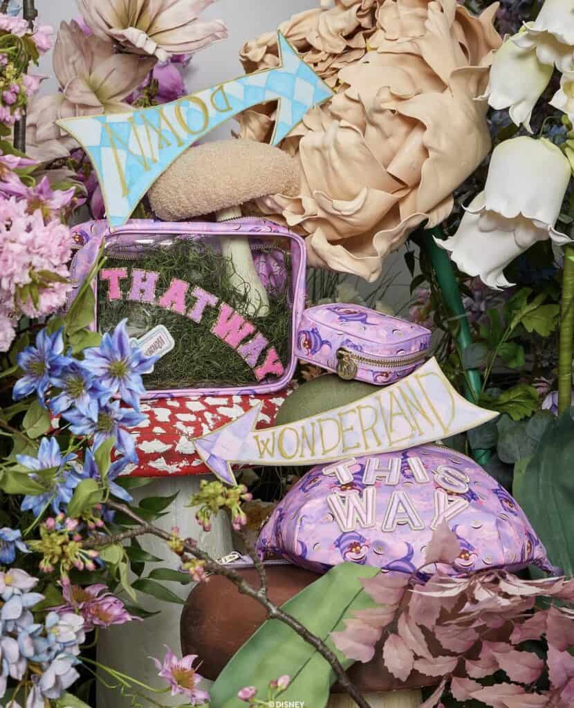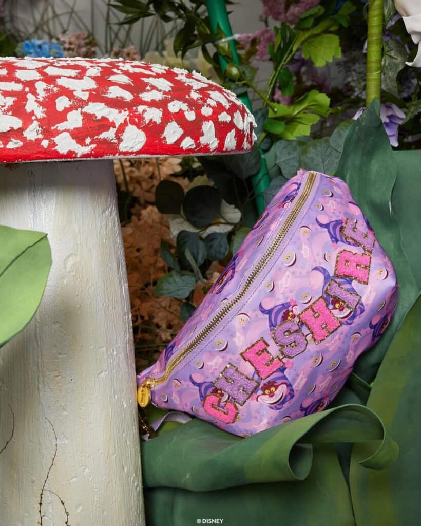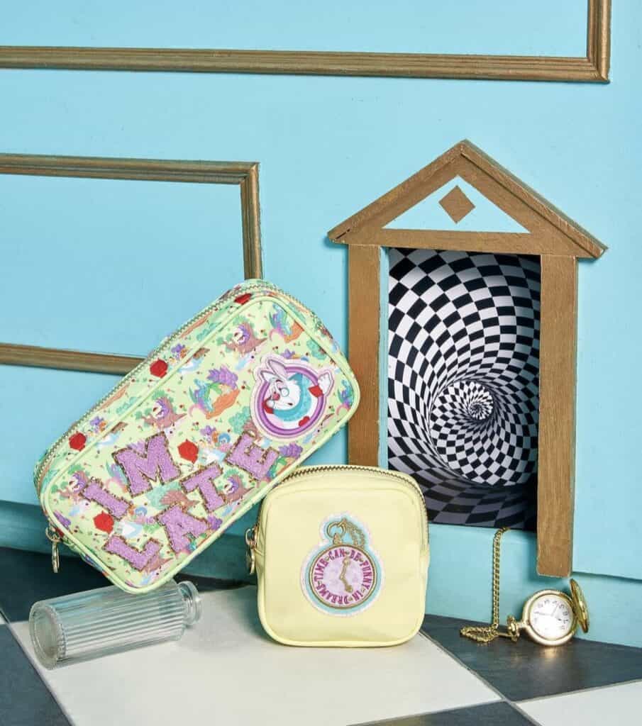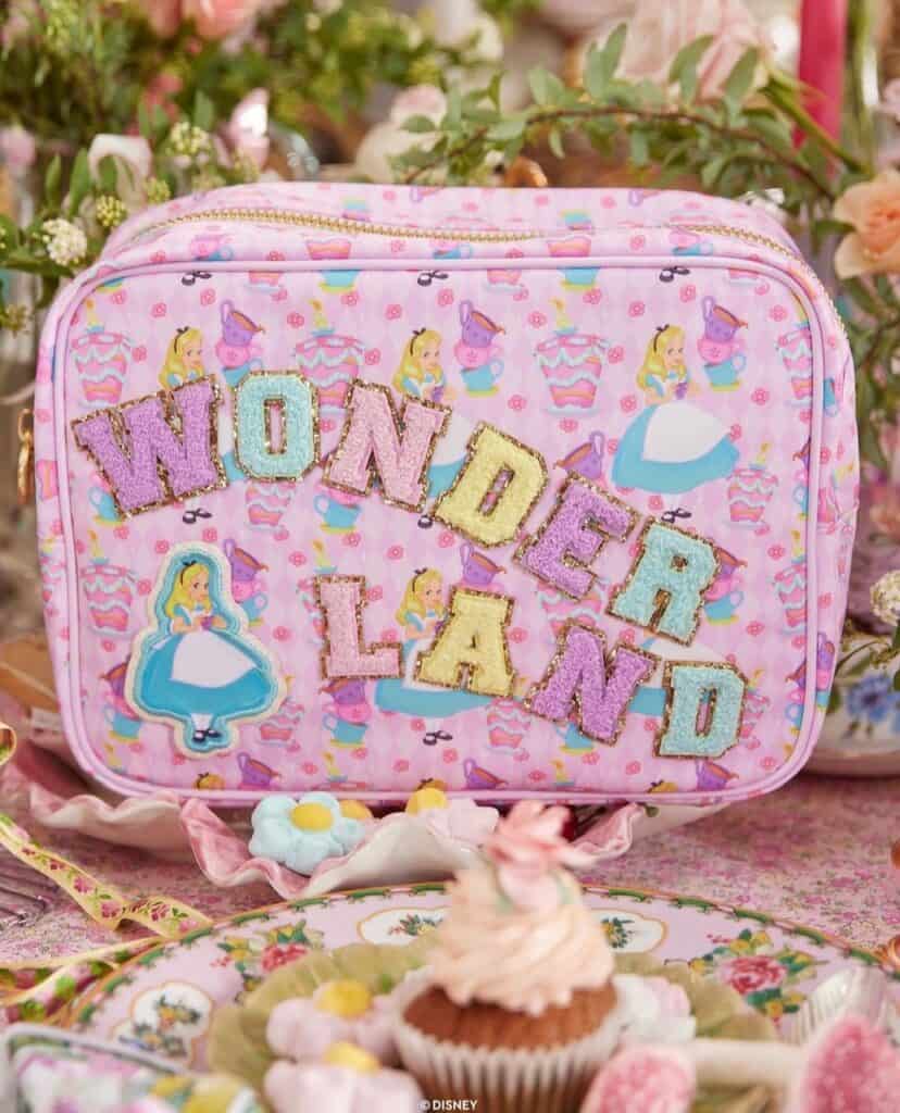 Look closely to discover some of the patches included with the Alice in Wonderland collection. Of course, we see the Cheshire Cat. If you look at the clear “Thataway” pouch you’ll find a directional arrow patch with the word Wonderland, similar to the sign in the picture. Mr. Late for Everything White Rabbit gets a nod, as well as his timepiece. The 4th picture shows a departure from the typical varsity alphabet. The pearl letters with the pale pink is so feminine! Add the adventurer herself to any bag with the dainty, Alice holding a teacup patch.