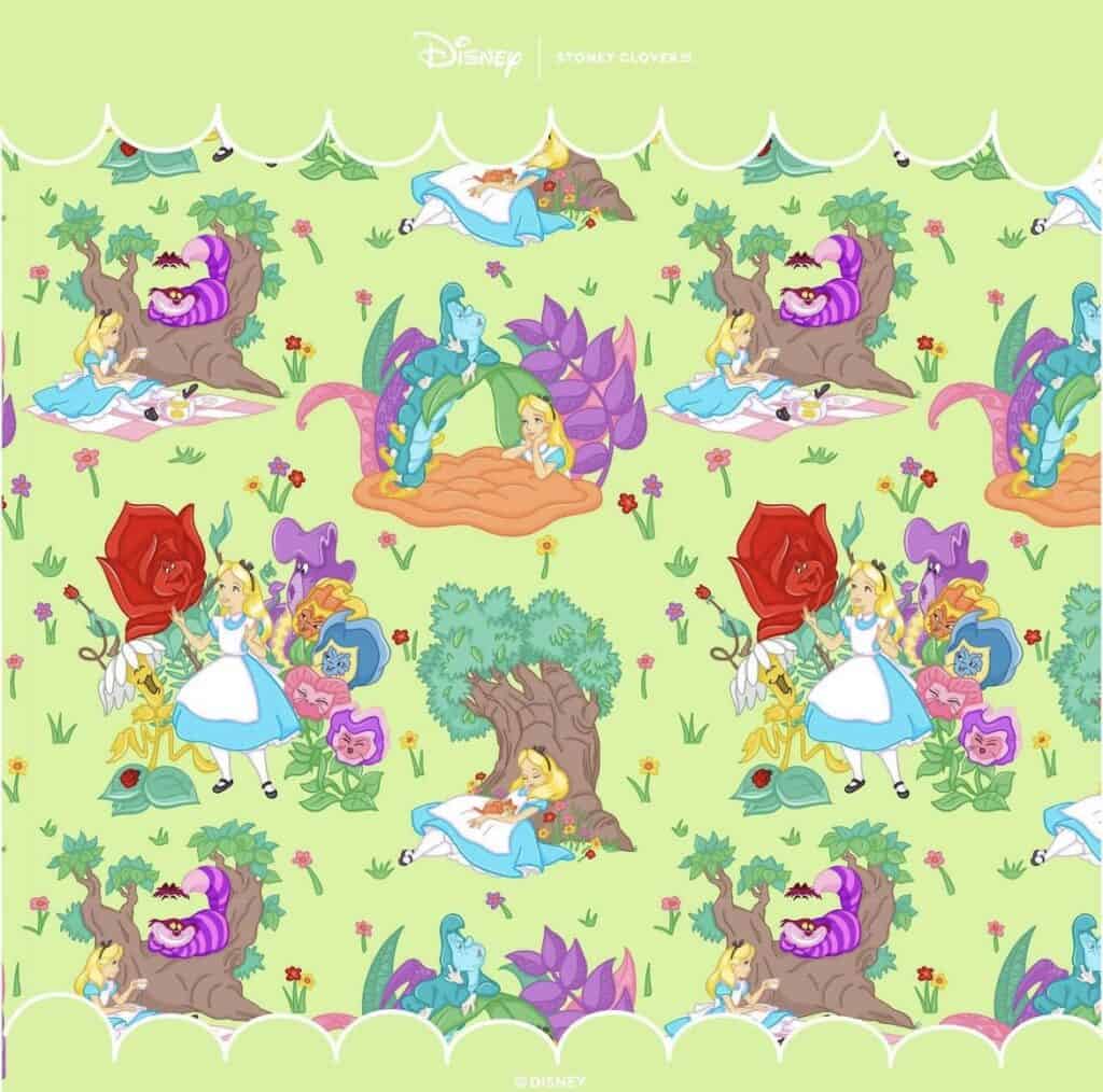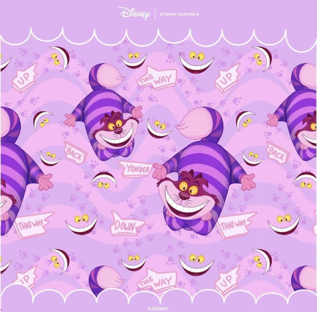 As of the time of writing, four main patterns have been revealed. Each one is full of color and personality. In Wonderland showcases Alice’s time there along with some of the characters she meets. Four scenes involving Alice repeat against a green backdrop. Next, with shades of blue is Curiouser and Curiouser. Meaning increasingly strange, the phrase perfectly describes the subjects in the portraits: Mad Hatter, Queen of Hearts, March Hare, White Rabbit, Tweedle Dee and Tweedle Dum, and the Cheshire Cat. Speaking of the Chesire Cat, We’re all Mad Here aptly titles the last print. What would be an Alice collection without a Very Merry Unbirthday print? No worries, you can have your cake and eat it too, with a side of tea of course! The mischievous grin of the disappearing cat intermingles with directional arrows offering nothing but confusion on which way to go.