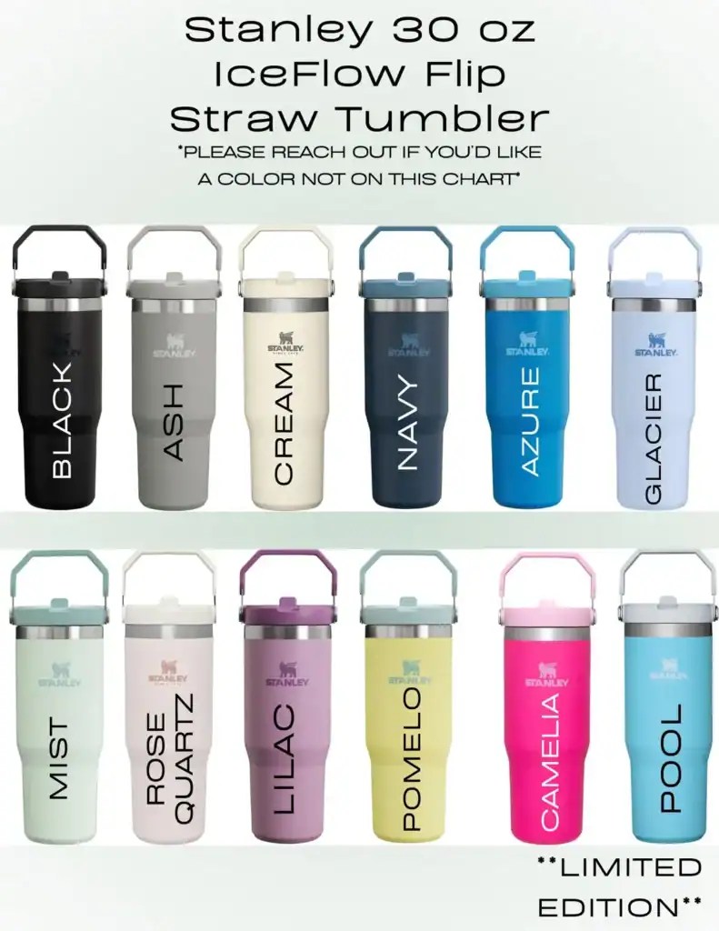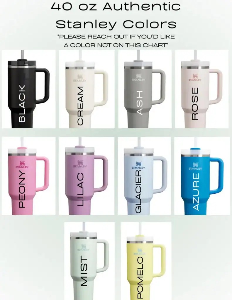 You can choose between a nonbranded 40oz tumbler, an authentic 40oz Stanley Quencher, or a 30oz Stanley IceFlow that is laser engraved. They do come with the lid with handle and a straw.