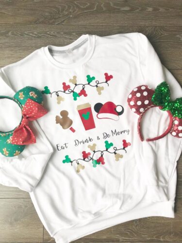 You can find this “Eat, Drink and Be Merry” sweatshirt on Etsy from MouseketearMomma HERE.