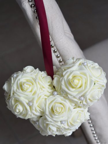 Flower balls have been an emerging trend for brides, and their bridal parties in recent years. This flower ball is shaped like a Mickey head! The creamy white roses are sprinkled with pearl accented that are surrounded by crystals. The bouquet is made from Real Touch foam roses, which have a crisp fresh cut flower look that holds shape and color over time.
