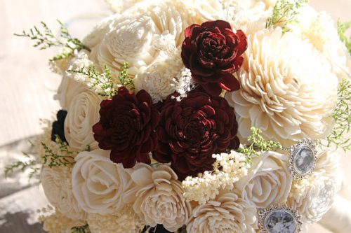 This is one of the bolder bouquets I’ve come across, and it’s fabulous. Red silk roses and ranunculus are accented with Mickey Ears and wrapped in satin. The satin wrap can even be customized to coordinate with your wedding colors.