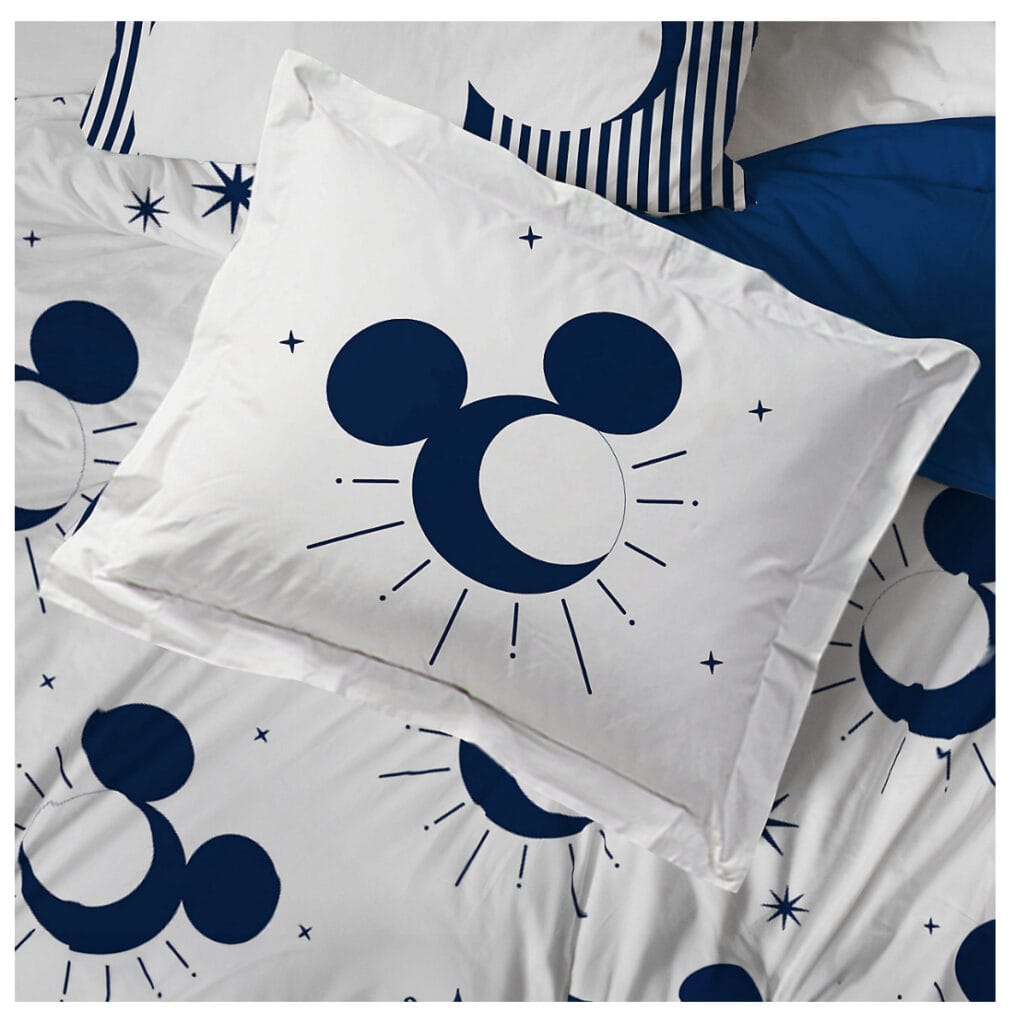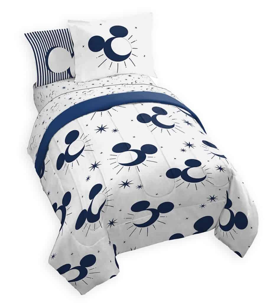 If the above comforter is Sunshine and Rainbows, then this one is Mickey on a clear crisp night! I love the color palette of the dark blue juxtaposed with the stark white for a clean look. Mickey is the moon and stars twinkle around him on this Disney version of Starry Night. Also reversible, you’ll find solid blue on the opposite side of the moons.