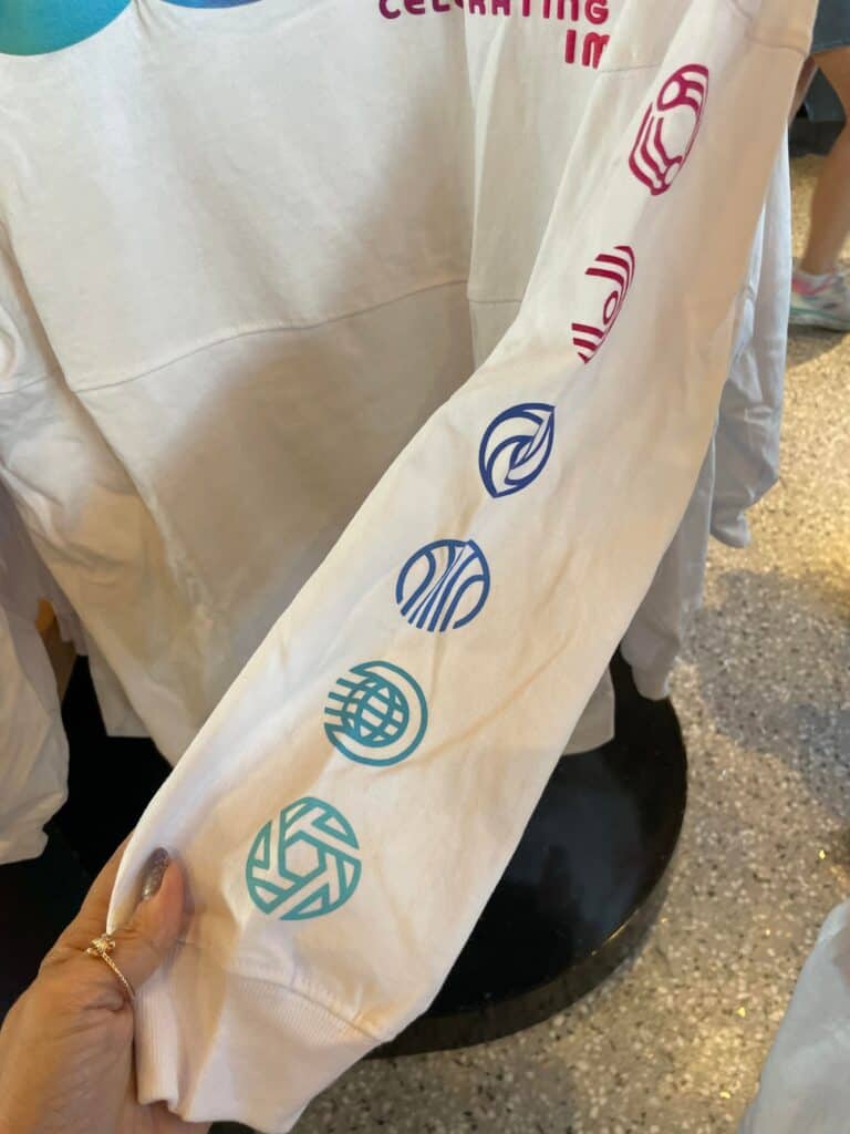 One of my favorite pieces from the new collection is this rainbow accented Spirit Jersey! The Spirit Jersey features the EPCOT 40 insignia on the front and back, plus printed pavilion icons on the sleeves. I can’t even narrow down which detail I love more!