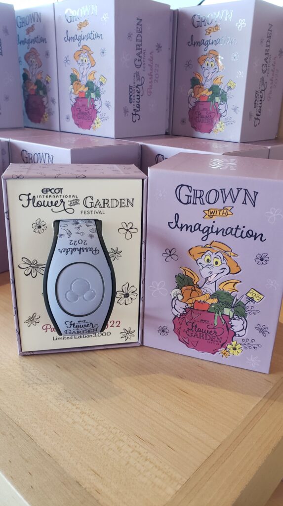 The Passholder MagicBand for this year’s festival features Figment – and is in his signature lavender color! It features the festival logo alongside Figment carrying a spring bounty of vegetables on one side. The opposite side has “Passholder 2022” and drawings of flowers and produce. The keepsake box that it comes in says, “Grow Your Imagination.” In other words, what could be more appropriate for EPCOT’s favorite dragon? It is Limited Edition (only 3,000 made) and retails for $39.99.