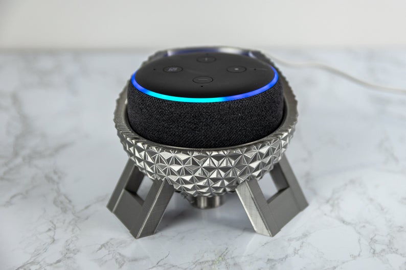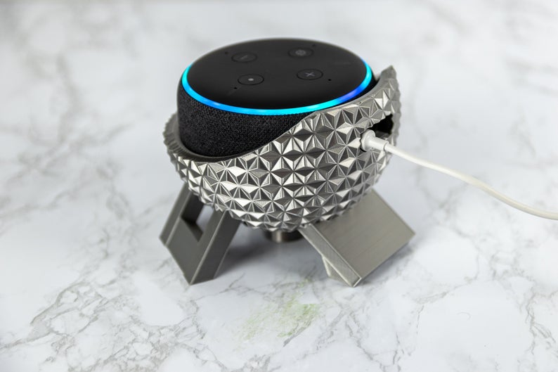 Inspired by Spaceship Earth, this 3D-printed Amazon Alexa Echo Dot holder is a must-have for any Disney fan. This product is printed in a reflective spaceship silver filament giving your Echo Dot a special Disney flair. It is designed to allow for the speakers in the 3rd Generation Amazon Echo Dot to project sound, while still maintaining its special Disney flair.