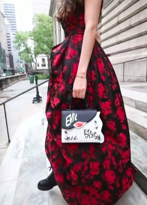 The pieces we have already shown you include this fabulous Evil By Design Satchel that features a black and white asymmetrical body with “Evil By Design” graffiti and a fabulous red accent that I think looks like lips! The ruffled top-carry handle and graffiti print lined strap add the finishing touches! This is the first bag in the collection that has been released and is currently available for preorder at danielle-nicole.com!