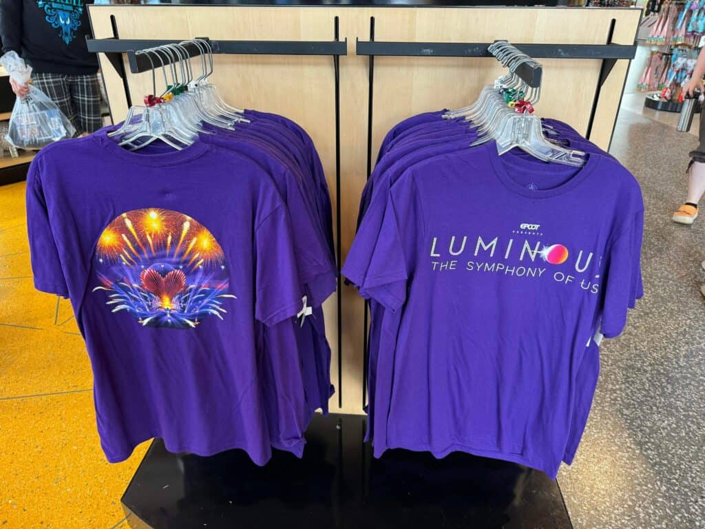 Four pieces of merchandise tied to the nightly show appeared in stores today. The first is a t-shirt with a colorful burst of celebration! I am digging the color combination of blues and oranges. The show’s logo, found on the front beautiful purple shirt, declares “Luminous: The Symphony of Us.” It’s the back of the shirt that captures the heart, literally. Pyrotechnics in the shape of a heart explode from the center with accent fireworks surrounding.