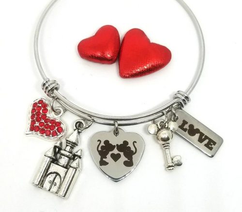 A ruby red heat, Mickey and Minnie sharing a smooch, a Disney Castle, key, and love charm adorn this lovely bangle bracelet. It’s the perfect touch of sparkle for any outfit but would look particularly great on Valentine’s Day! You can get it on Etsy from cornercraftshop for $19.79.