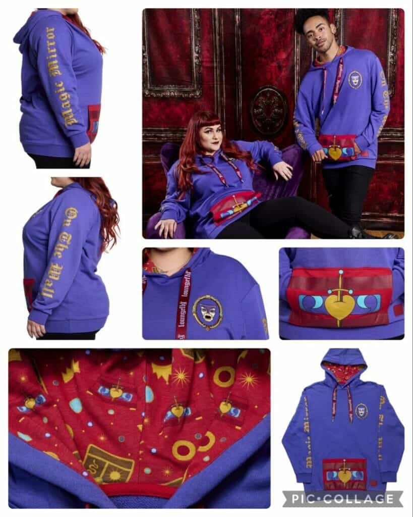 The last item in the Evil Queen collection is a unisex themed hooded sweatshirt. The hood is lined in the same red pattern as the purses and is offset by a beautiful royal blue. Old Fashioned gold lettering reads “Magic Mirror” on one sleeve and “On the Wall” down the other. Said Mirror proclaims his answer from the front chest area of the sweatshirt. The telltale box meant for Snow White’s heart is disguised as the front pocket of the garment.