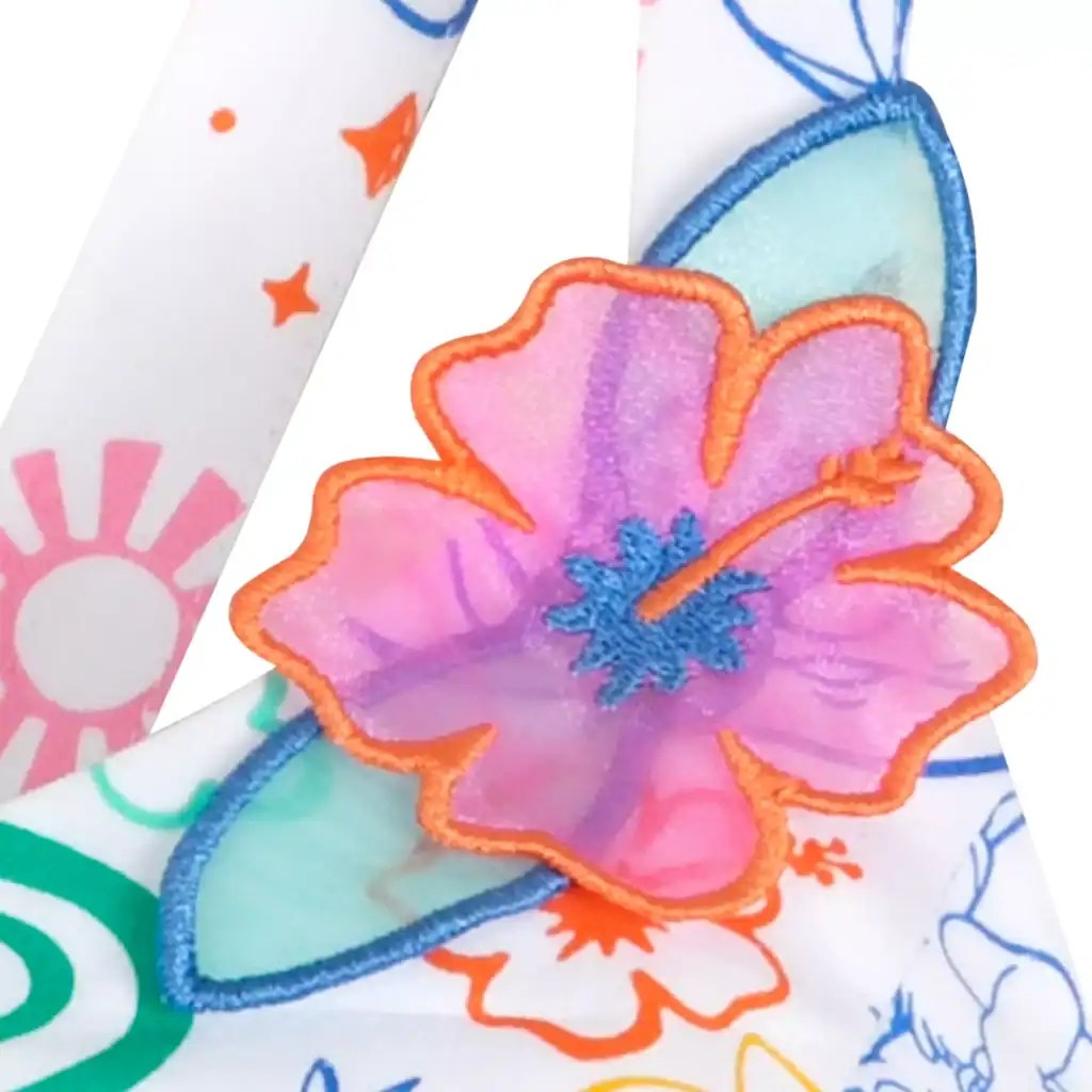 It’s all in the details! The front shoulder has a gorgeous Hibiscus flower accent which really pops against the white print. It also accentuates the Hibiscus flower that is found throughout the print. Speaking of the print, the print itself features Stitch, ”Aloha,” ”Stitch,” pineapples, flowers, planets, and more. I’m loving the colors they chose for the print! They are bright and fun and perfect for Summer!