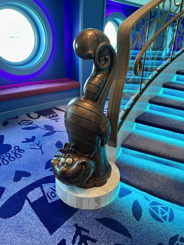 For those who prefer to keep their feet solidly underneath them, you can enter the club via an enchanting stairway as well. As soon as you reach the bottom, you are greeted by the Chesire Cat, letting you know that you have entered a wonderous world where anything can happen. As an added health feature, as soon as you depart from the slide, you are met with several hand washing stations to use before you even enter the club. I’ll share more about these AWESOME sinks a bit later, but believe me, they are magical.