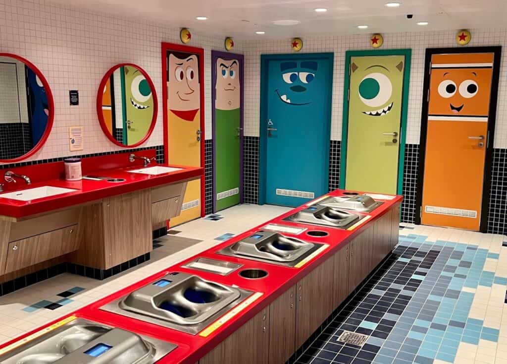 Our favorite Pixar friends line the stall doors while red countertops and blue tiles make this area extra fun. Also, check out these sinks! I mentioned above how cool these sinks are, and they definitely deserve a moment for themselves. You don’t have to worry about proper hand-washing techniques with these sinks. All you need to do is place your hands in the basins, and technology does the rest. From applying soap to rinsing you clean; the entire process is automated. Leave it to Disney to figure out a way to make hand washing fun!