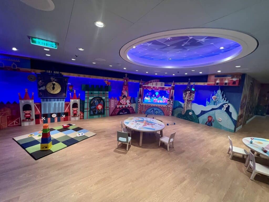 Finally, the last space in the Disney Wish Oceaneer Club is the It’s a Small World Nursery. This space is open for ages 6 months to 3 years old and offers an enchanting nursery experience. The different motifs on the walls are interactive for those who are nearing that 3-year age, while soft spaces and cribs are available for the youngest cruisers.