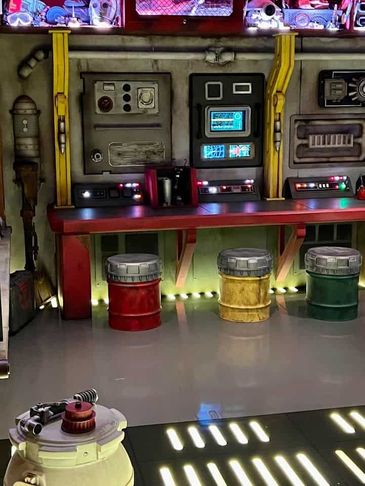 The highlight of this space is being able to design and test your own rollercoaster! Kids can create a coaster along the lines of Big Thunder Mountain Railroad, Space Mountain, or Matterhorn Bobsleds. Then, they can climb into a ride vehicle and virtually ride their masterpiece. During Open House, I definitely saw a dad having a blast with this awesome new experience.