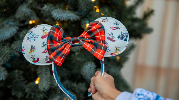 First up are these precious Walt’s Holiday Lodge Ears that were in the merchandise preview that include Mickey and his pals enjoying time in the snow at a ski castle lodge! The plaid bow tops them off!