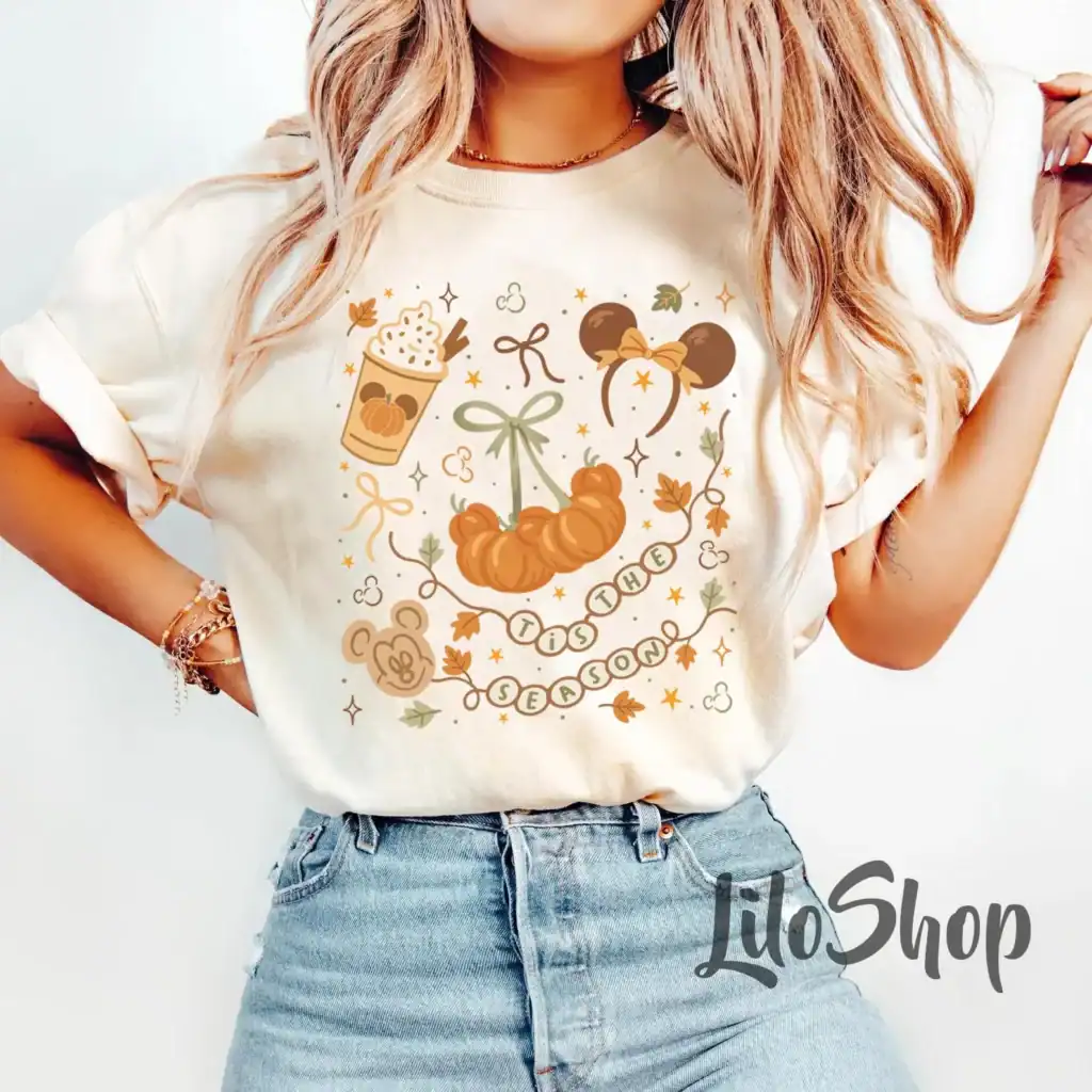 The cream-colored tee is decorated with a charming fall design featuring Mickey-shaped pumpkins, seasonal leaves, and plenty of magical touches. At the center, a Mickey pumpkin wreath tied with a bow celebrates the season in true Disney style. Surrounding details include Mickey pumpkin balloons, a festive coffee cup with whipped cream, and playful stars that bring extra whimsy to the design. The phrase “‘Tis The Season” is spelled out in a garland of letters, tying the entire look together in a way that feels both festive and fashionable.