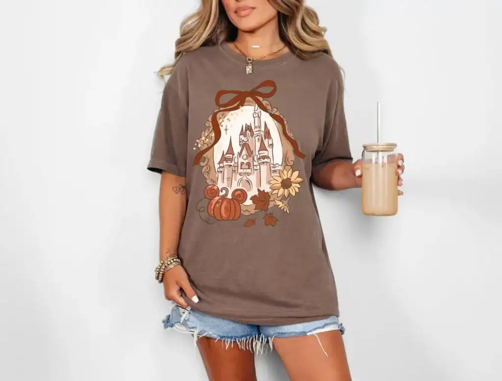 Autumn is in the air, and PixieDustTradeCo on Etsy has captured the season’s magic with the perfect Fall Castle T-shirt. This cozy piece brings together a dreamy Disney castle with all the charm of autumn leaves, pumpkins, and sunflowers—making it an instant must-have for Fashionistas who want to show their seasonal style.