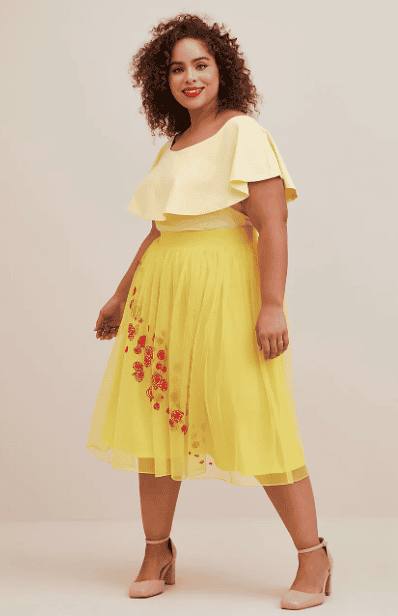 Let’s talk about the skirt and top ensemble that has me intrigued. I REALLY want this but the skirt isn’t online yet for some reason (maybe it is now while you are reading it)! I need the entire ensemble. The skirt is one of Belle’s signature colors and the red roses on the tulle… gorgeous! I think the top really pulls the look together and adds that touch of femininity I was talking about.