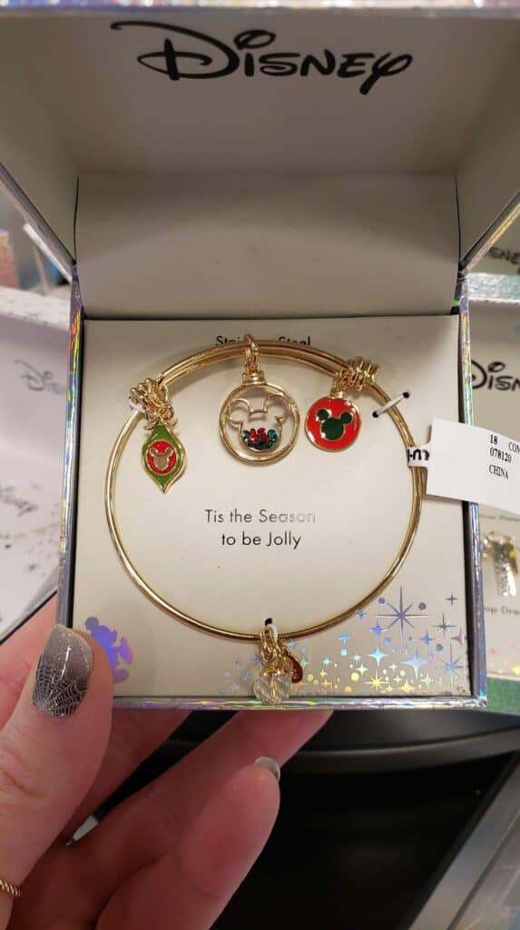 There is even a matching bracelet to finish the set. The bracelet has the same Mickey ornament and two additional red and green ornament charms. Both of these colorful charms also have Mickey heads. The look is complete with a tiny crystal heart charm.