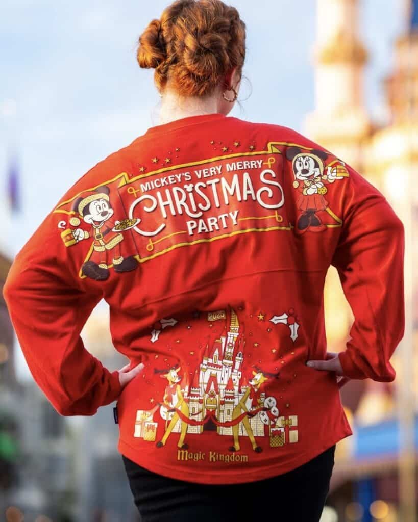 This year’s Spirit Jersey is bursting with holiday cheer in a bold red design. Across the back, the words “Mickey’s Very Merry Christmas Party” stand out in whimsical white lettering, framed by golden details. Mickey and Minnie appear dressed for the holidays, ready to celebrate with cookies, cocoa, and plenty of Christmas spirit.