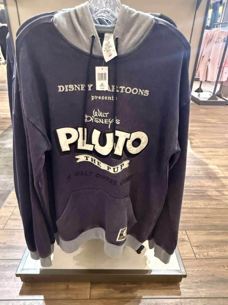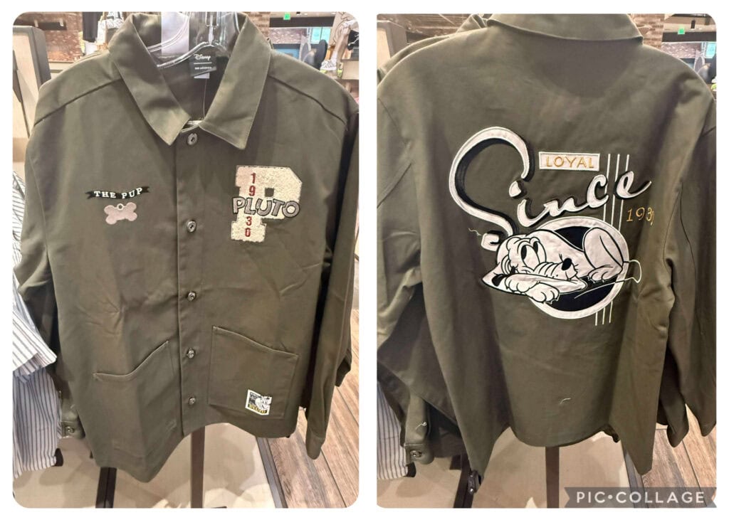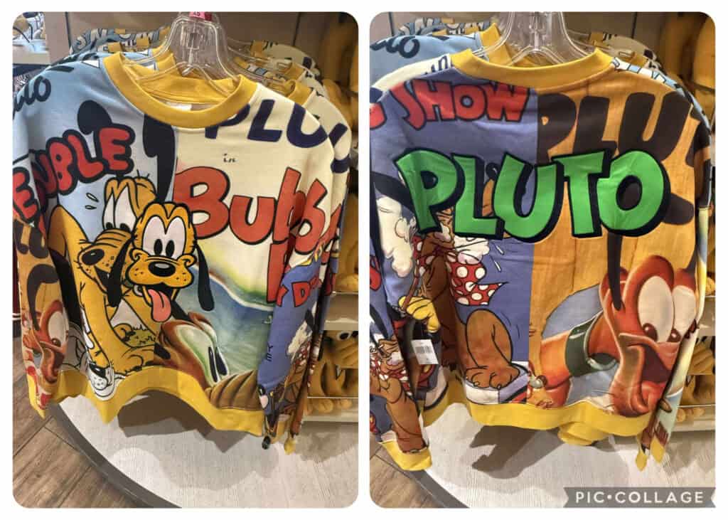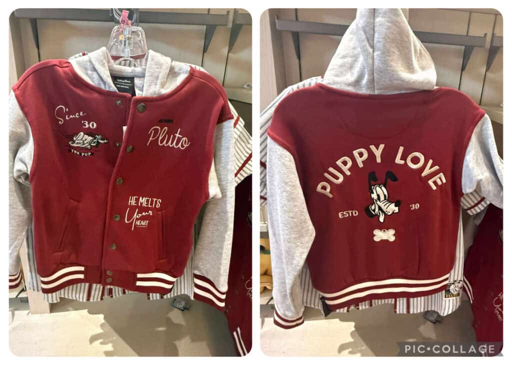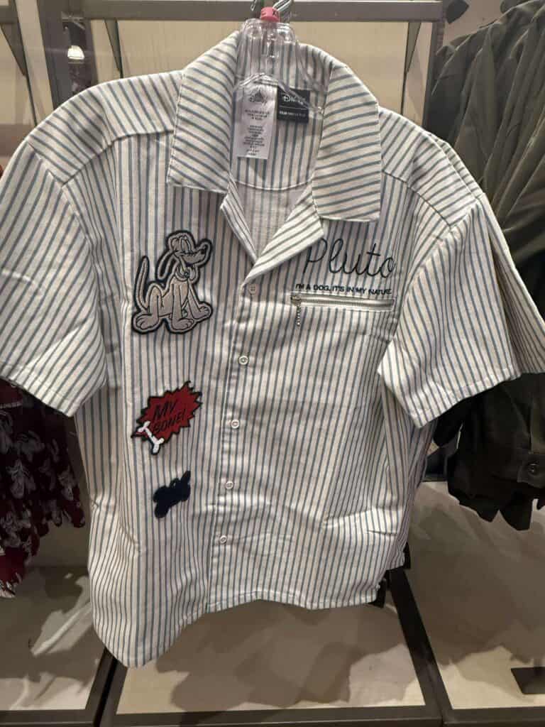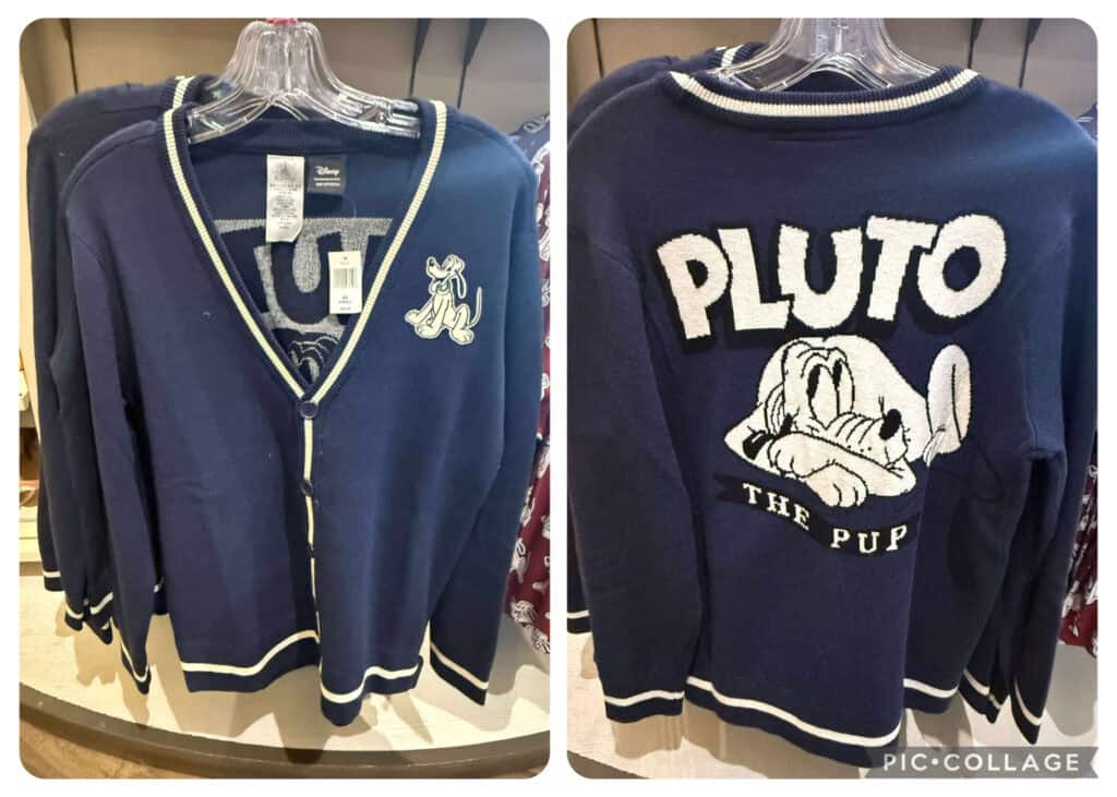 And they call it “Puppy Love.” The 1960s song by Paul Anka and later sung by Donny Osmond fills my head as I gaze upon this first grouping. Mainly because that’s the theme of the Varsity jacket. Embroidered on the front is the phrase “He melts your heart,” Pluto’s name in script, and an appliqué of Mickey’s dog. Other apparel in this collection that has both front and back designs is a V-Neck cardigan, baseball jersey, button-down shirt, and graphic sweater.