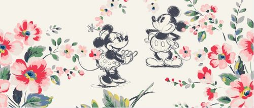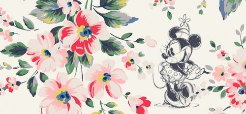 Of course, with a sneak peek like this one, we don’t have all the information or patterns but we do know that the above will be one of the patterns available. As you can see, the vintage sketches of Minnie Mouse show her with a flower in her hair…. now that is retro! It seems only fitting to see her with a beautiful floral print; Spitafields Rose. Mickey and Minnie Bouquet sits pretty on pieces for the home in the next collection.