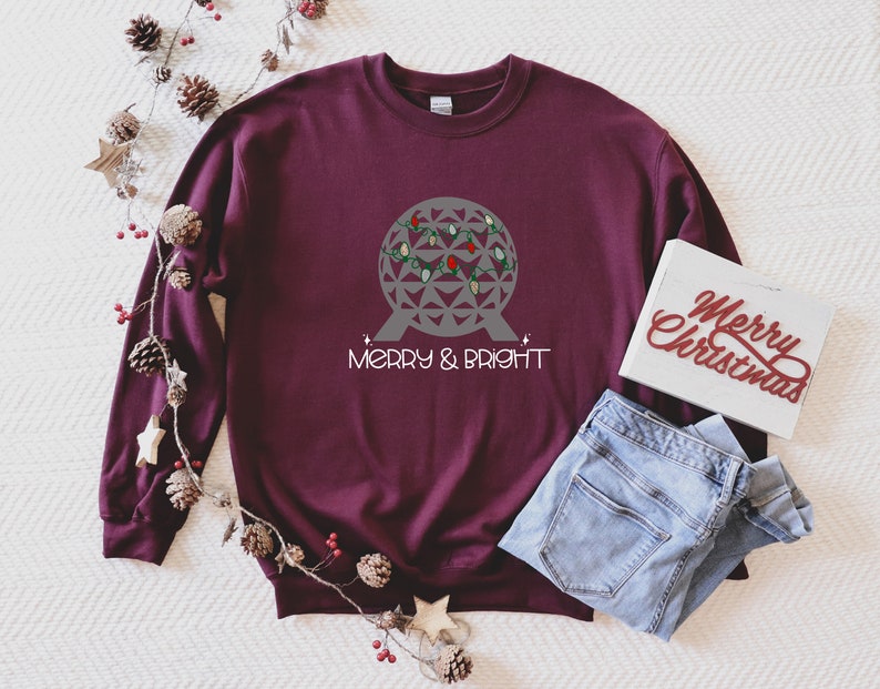 I love that Spaceship Earth is getting some holiday love on this design! So often we see Cinderella Castle dressed up for the holidays. Spaceship Earth looks amazing decked out in holiday lights! You can find the Merry and Bright Epcot Christmas Sweatshirt on Etsy from DreamlandSupplyCo. Pricing starts at $24.00.