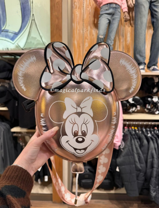 The coordinating Loungefly backpack takes this look to the next level. Designed to resemble Minnie Mouse as a balloon, the backpack showcases her smiling face front and center, framed by that same rose gold metallic finish. The Minnie balloon shape is instantly recognizable and incredibly fun, while still feeling polished enough to pair with a wide range of park outfits. Adjustable straps and Loungefly’s signature compact design make it practical for a full park day without sacrificing style.