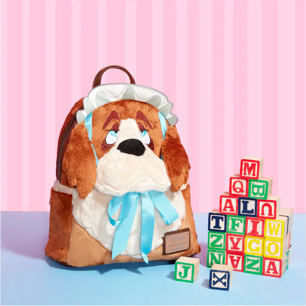 The front of the backpack and wallet shows Nana’s kerchiefed head, done in soft padded applique. A powder blue 3D ribbon completes the look. Die-cut plush ears bring Nana to life, and the body of the backpack is plush as well. The back includes embroidered children’s toy blocks that spell out Nana’s name. I absolutely adore Nana, so this is one that I definitely need for my ever-growing Loungefly collection.
