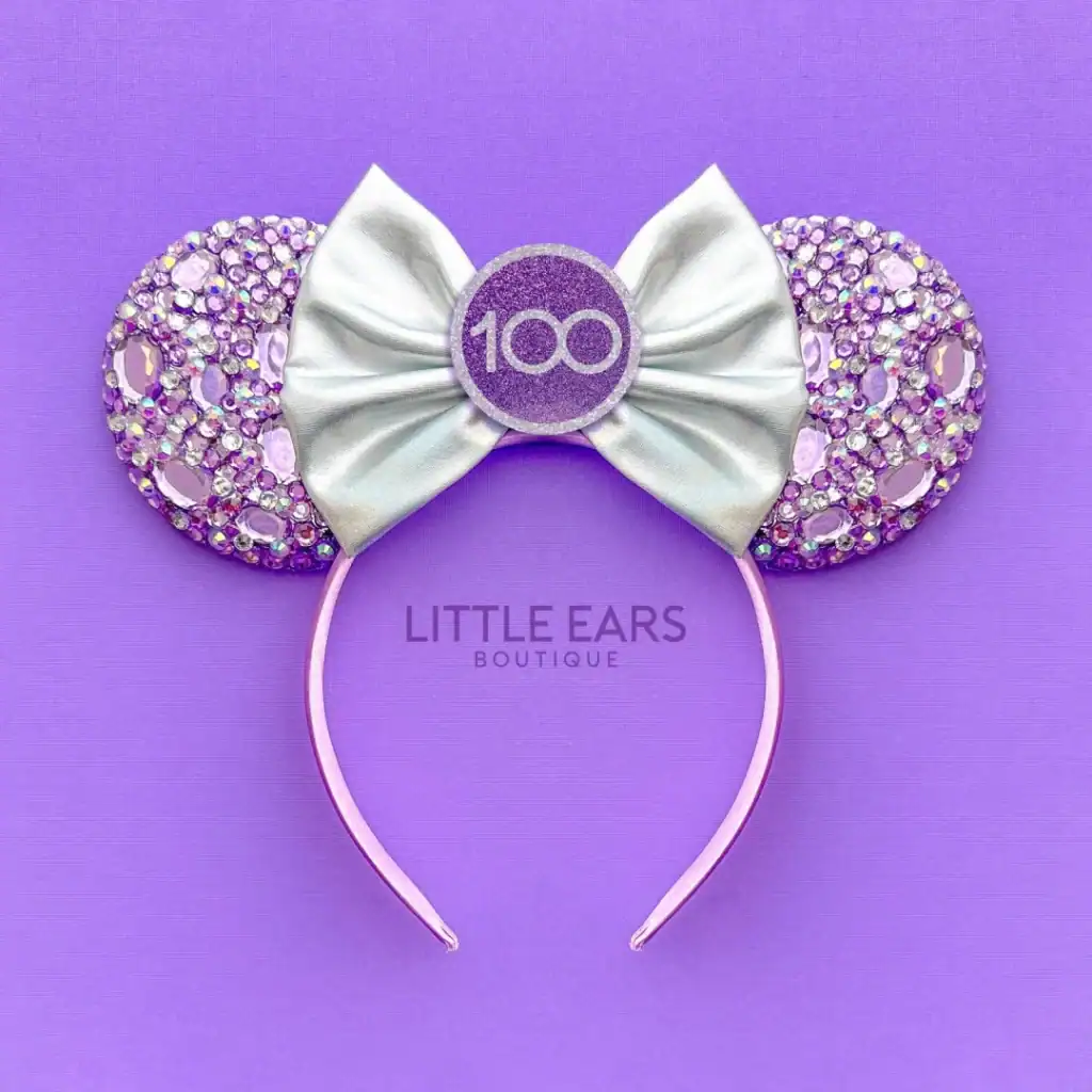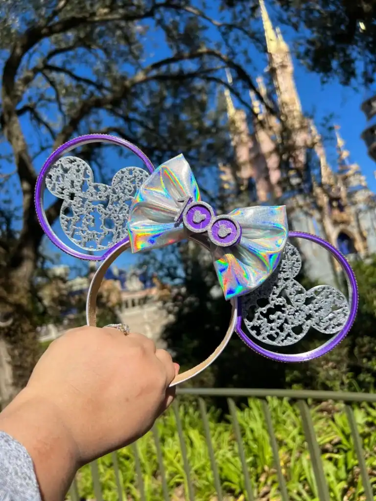 Get ready to sparkle during the celebration when you wear these silver metallic ears! Featuring silver rhinestones (including a hidden Mickey), a silver metallic bow, and a purple sequin bow, these ears definitely pop. love the double bow on these ears! The more bows, the more fun! You can get these ears on Etsy from DottiDesignsShop.